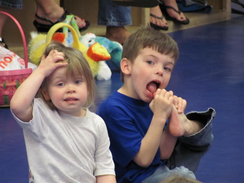 Alex_KarateEggHunt.JPG - I'm so hungry I could eat my own foot!?...(Jess apparently had one too many chocolate milks last night?!...)P