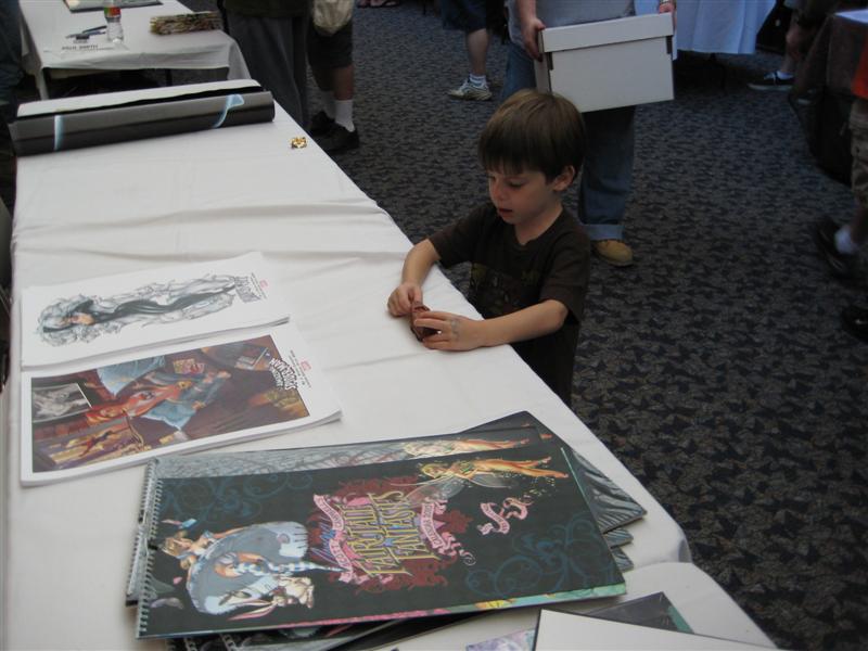 JScottCampbell_DallasCon09.JPG - Playing with my new (used) Jawa sandcrawler complete with little dudes inside while Daddy visits with J. Scott Campbell - some comic artist dude at the Comicon!
