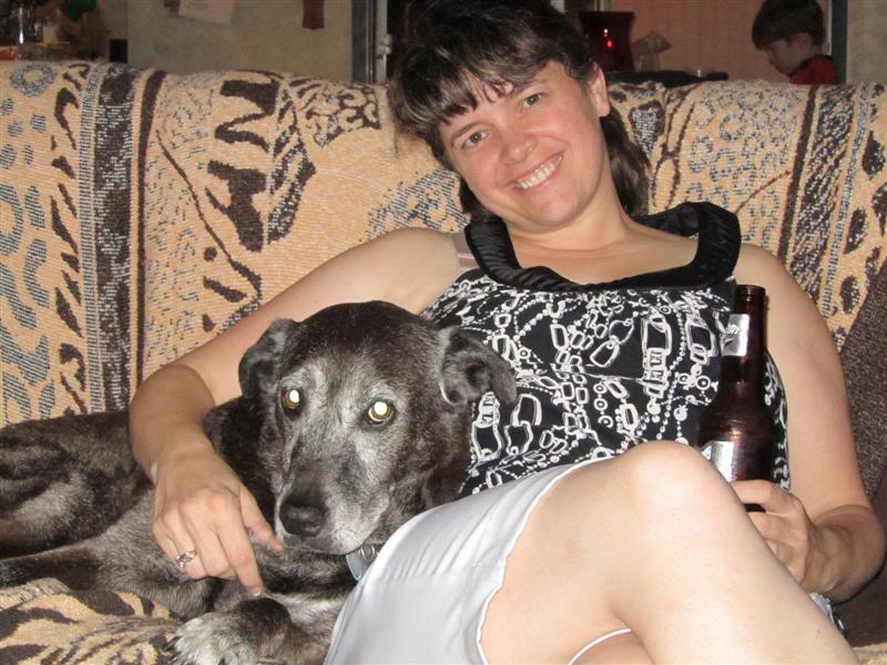 Dawn_Nossa.JPG - Mummy (w/ some peace & quiet juice) cuddling Ms. Nossa.  She's our favorite - She's old and grumpy... just like Daddy! (he he)